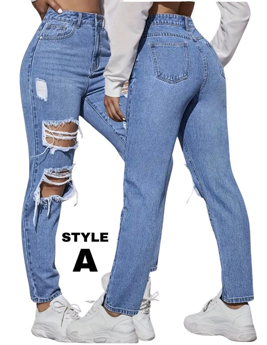 Ripped Holes Distressed, Baggy No Stretch Jeans with Holes, High Rise Washed Blue Streetwear Denim Pants, Women's and Girl’s Denim Jeans & Clothing