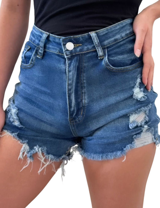 High Rise Waist Distressed Stretchy Denim Blue Jean Shorts with Rolled Hem