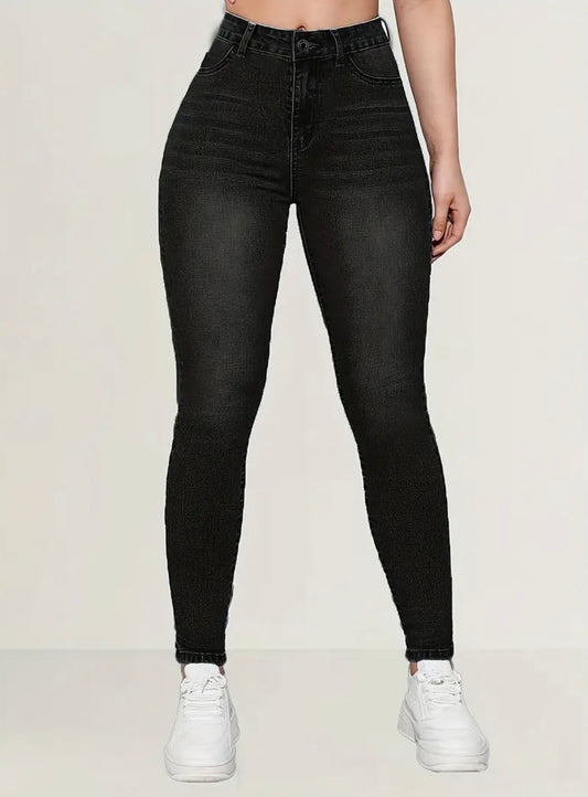 Elegant High-Waisted Black Denim Jeans for Women - Solid Black Color, Tight Fit, High Stretch Fabric, Woven, Button Detail, All-Season Wear