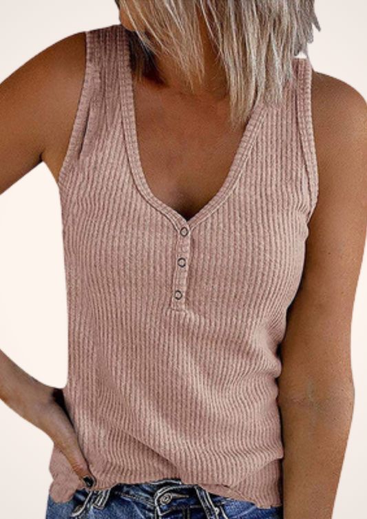 Pink V Neck Ribbed Knit Sleeveless Henley Tank Top with Buttons