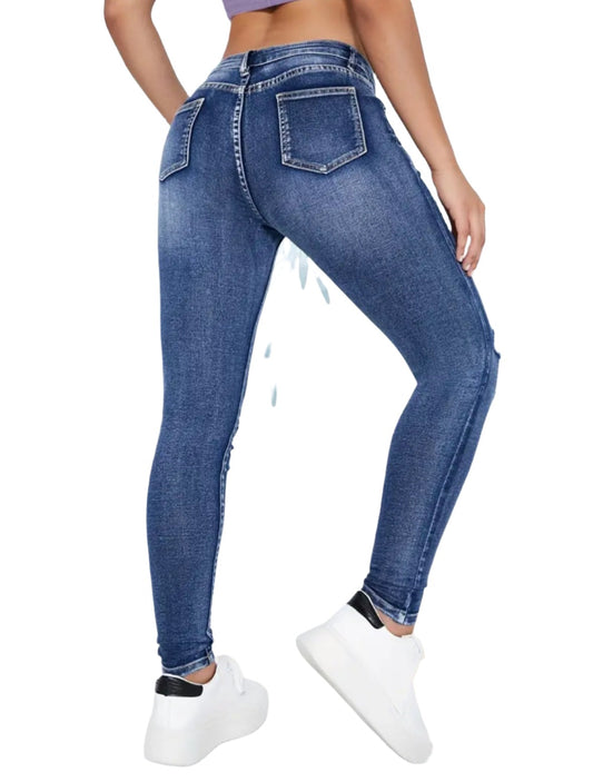 Mid Rise Blue Ripped Holes Skinny Jeans, Slim Fit Distressed Water Ripple Embossed Tight Jeans, Women's Denim Jeans & Clothing