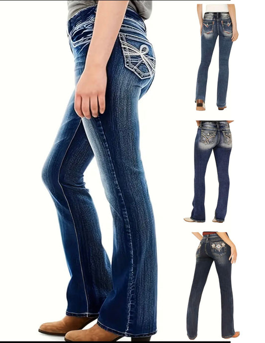 High Rise Embroidered Pocket Niche Bootcut Jeans, Stretchy Washed Denim Pants, Slant Pockets, Women's Denim Jeans, July 4th Outfits Jeans