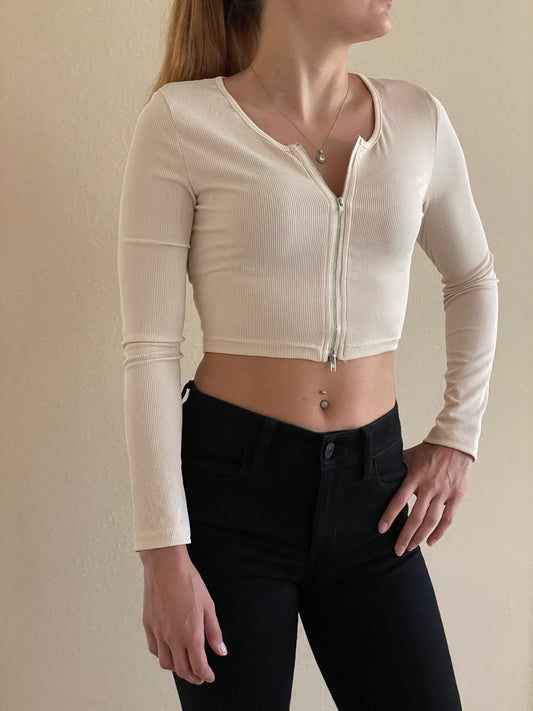 Long Sleeve with Double Front Zipper Crop Top in Cream, Summer Top, Women's Top