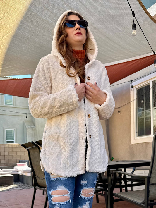 Solid Button Up Hooded Teddy Coat, Elegant Long Sleeve Split Side Faux Fur Outwear Jacket,Women's Clothing, Teddy Winter and Spring Jackets Womenswear Comfort, Cozy Plush Fuzzy Sherpa Faux Shearling Coat