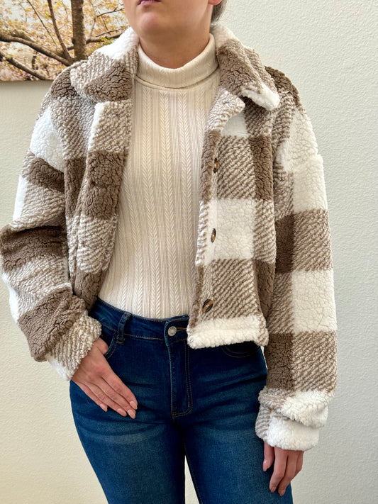 Plaid Button Front Teddy Coat, Casual, Soft, Comfortable Long Sleeve Coat For Winter & Spring, Women's Clothing