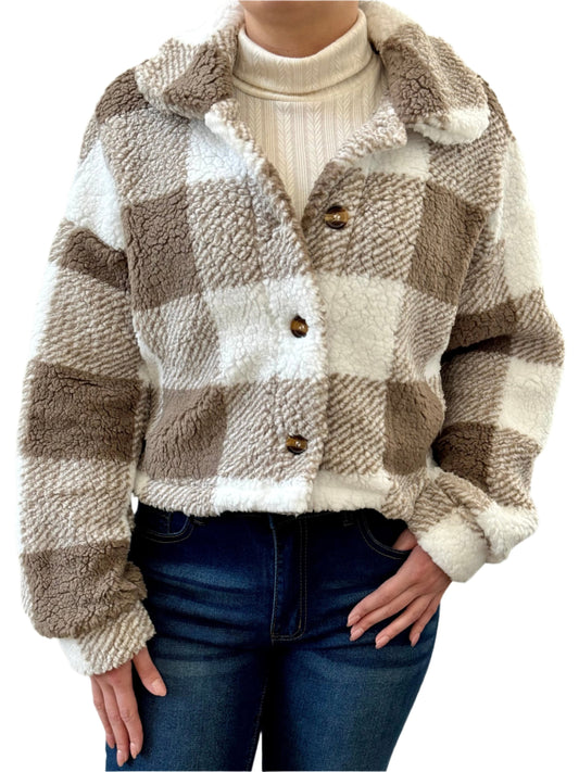 Plaid Button Front Teddy Coat, Casual, Soft, Comfortable Long Sleeve Coat For Winter & Spring, Women's Clothing