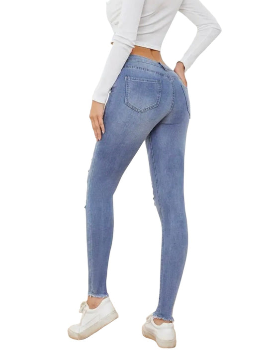 Mid Rise Ripped Holes Washed Skinny Jeans, Slant Pockets Raw Hem Stretchy Tight Jeans, Women's Denim Jeans & Clothing