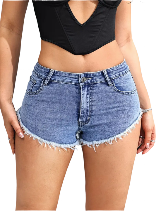 Low Rise Elegant Ripped Denim Jean Shorts, Stretchy, Short Shorts and Comfy, Low Waist and Distressed, Raw Hem, Womenswear