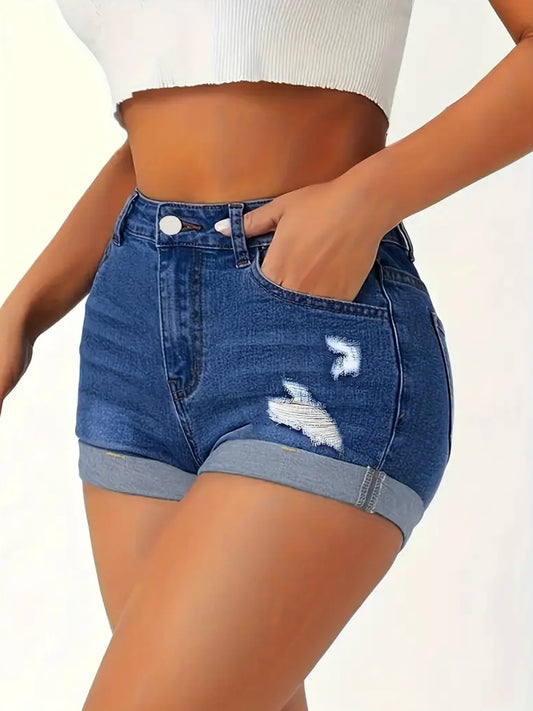 High Rise Waist Distressed Stretchy Denim Blue Jean Shorts with Rolled Hem