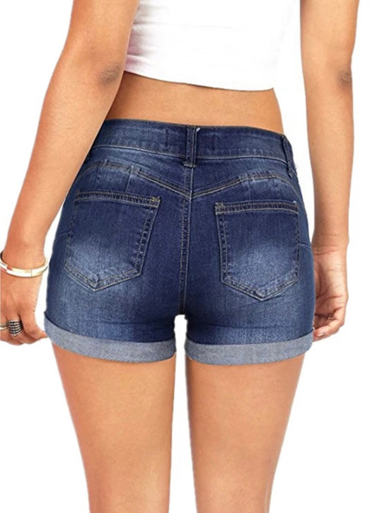 Mid Rise Waist Distressed Stretchy Denim Blue Jean Shorts with Rolled Hem