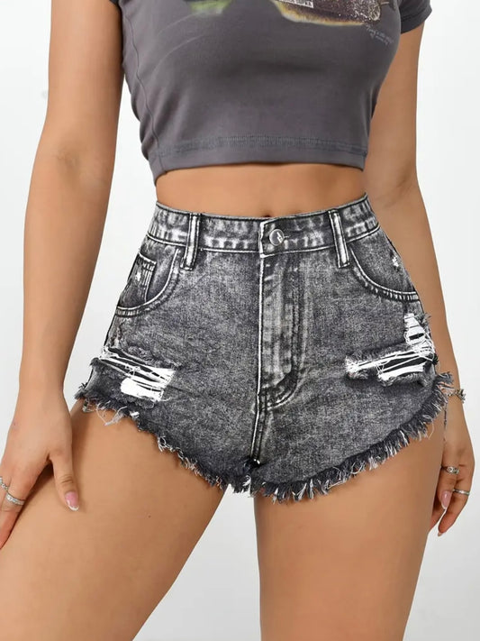 Women's Ripped Raw Hem Distressed Denim Shorts - Streetwear Washed Denim