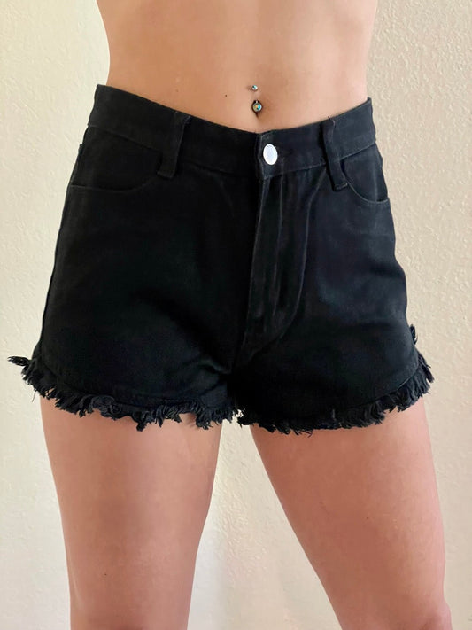High Rise Frayed Raw Hem Denim Shorts in Black