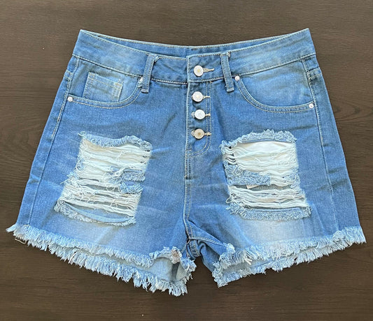 Mid Rise Frayed Raw Hem Ripped Blue Denim Shorts with 4-Button Fly