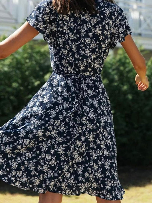 Fun Floral Print Navy Blue Tying Wrap Dress with Ruffles Dress, Beach Dress, Vacation Dress
