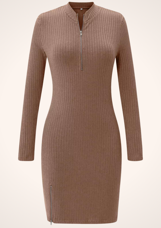 Zip It Up Front Zipper Brown Light Sweater Dress