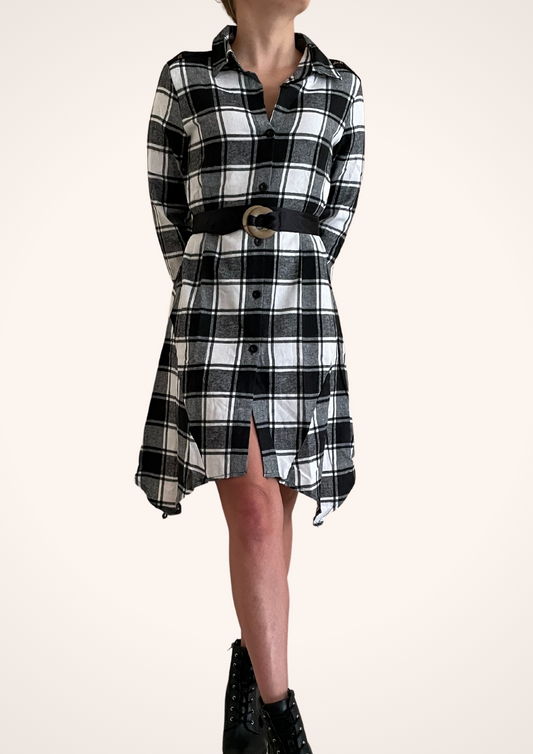 Perfectly Plaid Black and White Long Sleeve Belted Dress