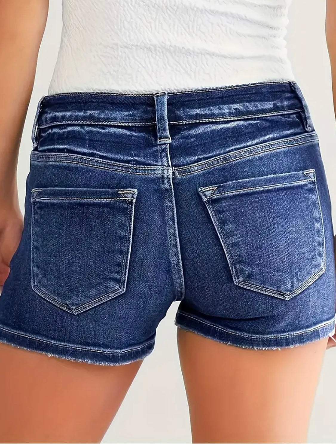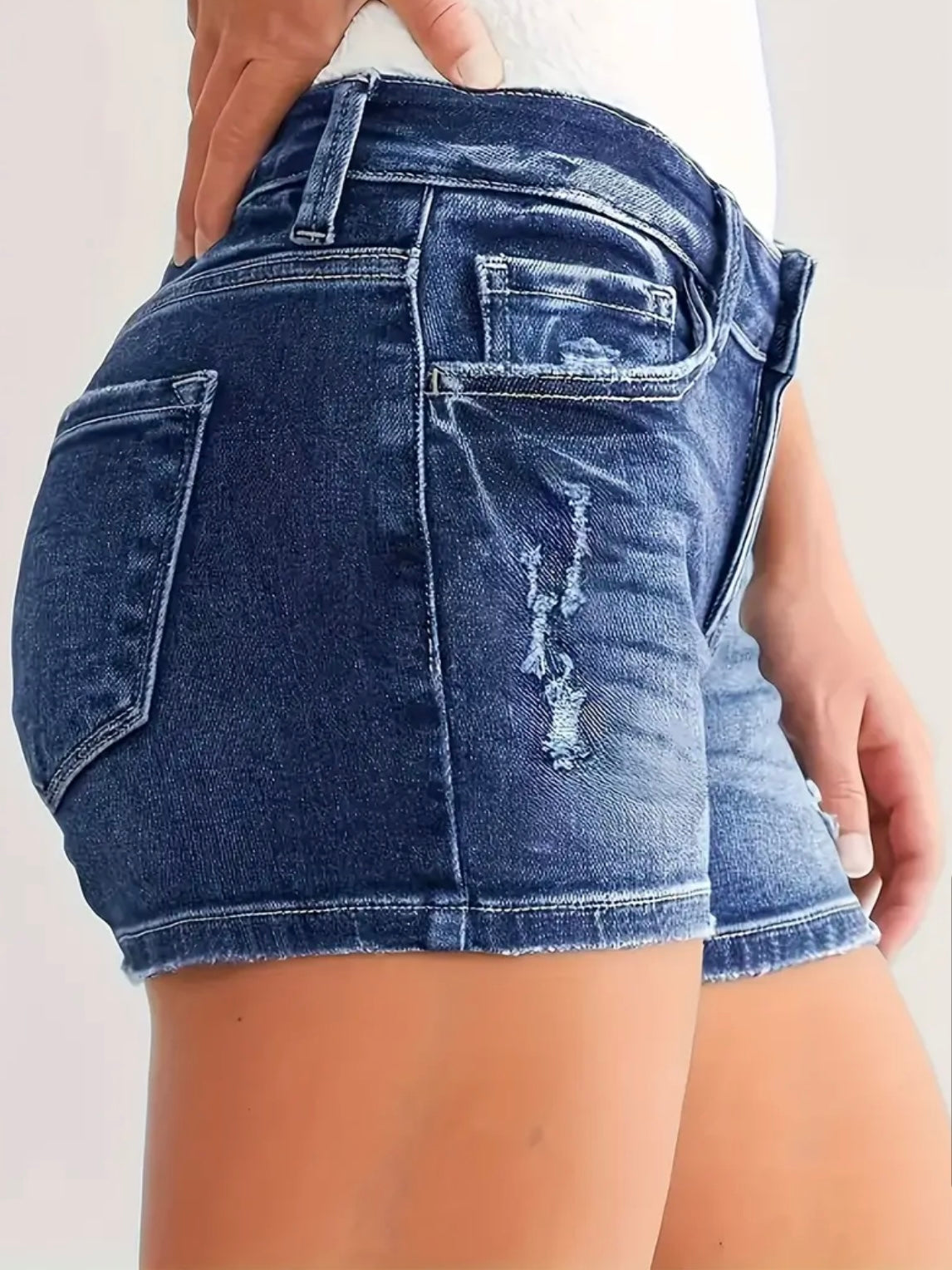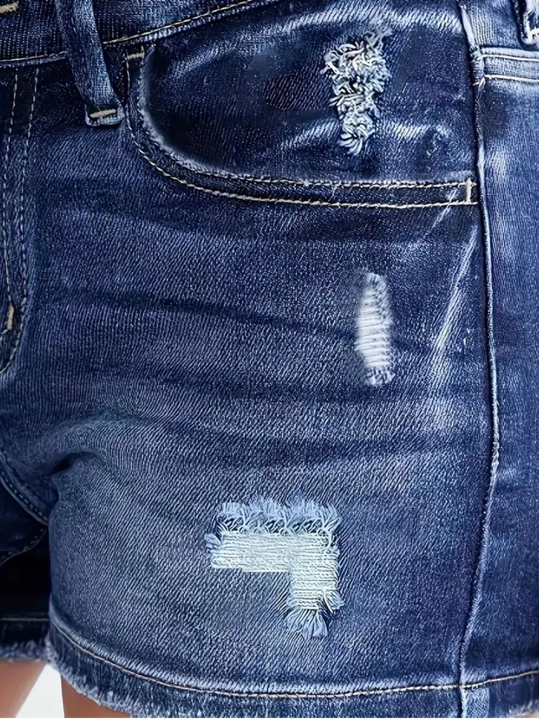 Ripped Whiskering Plain Denim Shorts, Distressed Blue Denim Shorts, Women's Denim Jeans and Clothing