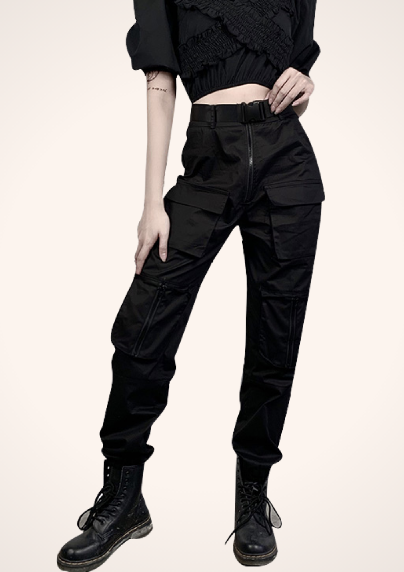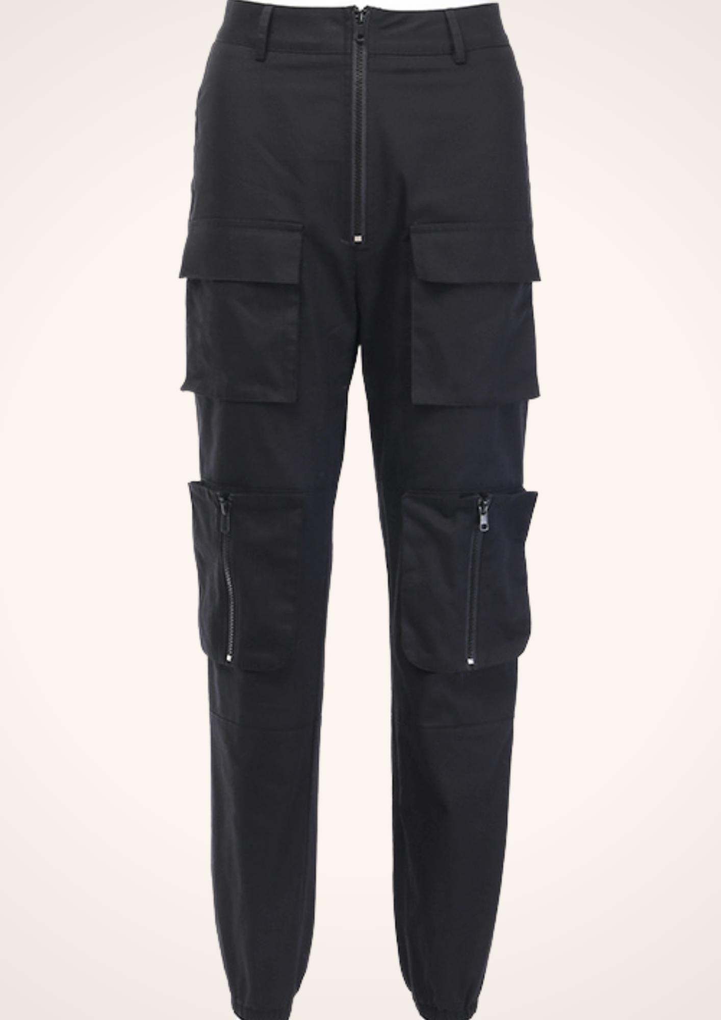 High Waist Loose Fit Harem Cargo Pants with Elastic Ankles in Black